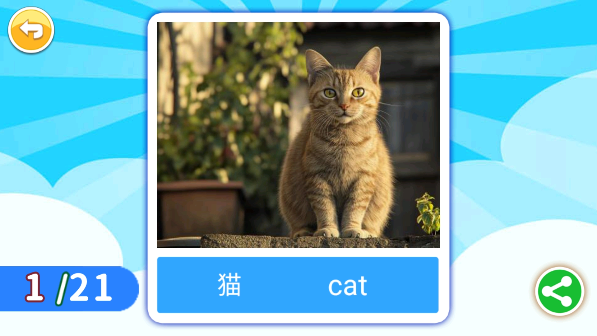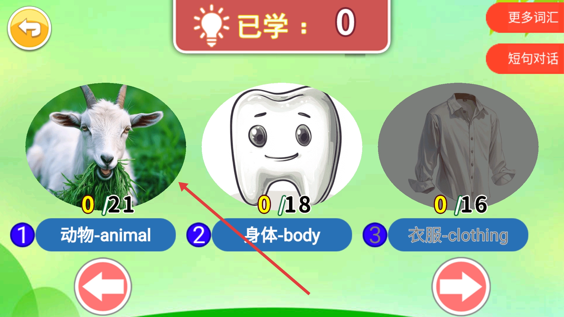 4、在动物词汇学习页面查看动物的中英文对照,如【猫-cat】,完成词汇学习操作。