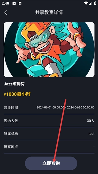 3、在共享教室详情页,可查看价格、营业时间等信息,点击【立即咨询】按钮可获取咨询渠道。