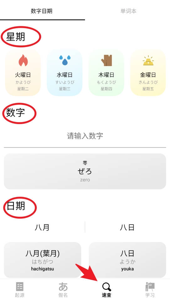 3、“速查”功能支持快速检索数字、星期、日期相关日语表达。举例来说,输入数字即可显示对应假名与罗马音;选择日期则能查看日语中月份和日子的具体读法。