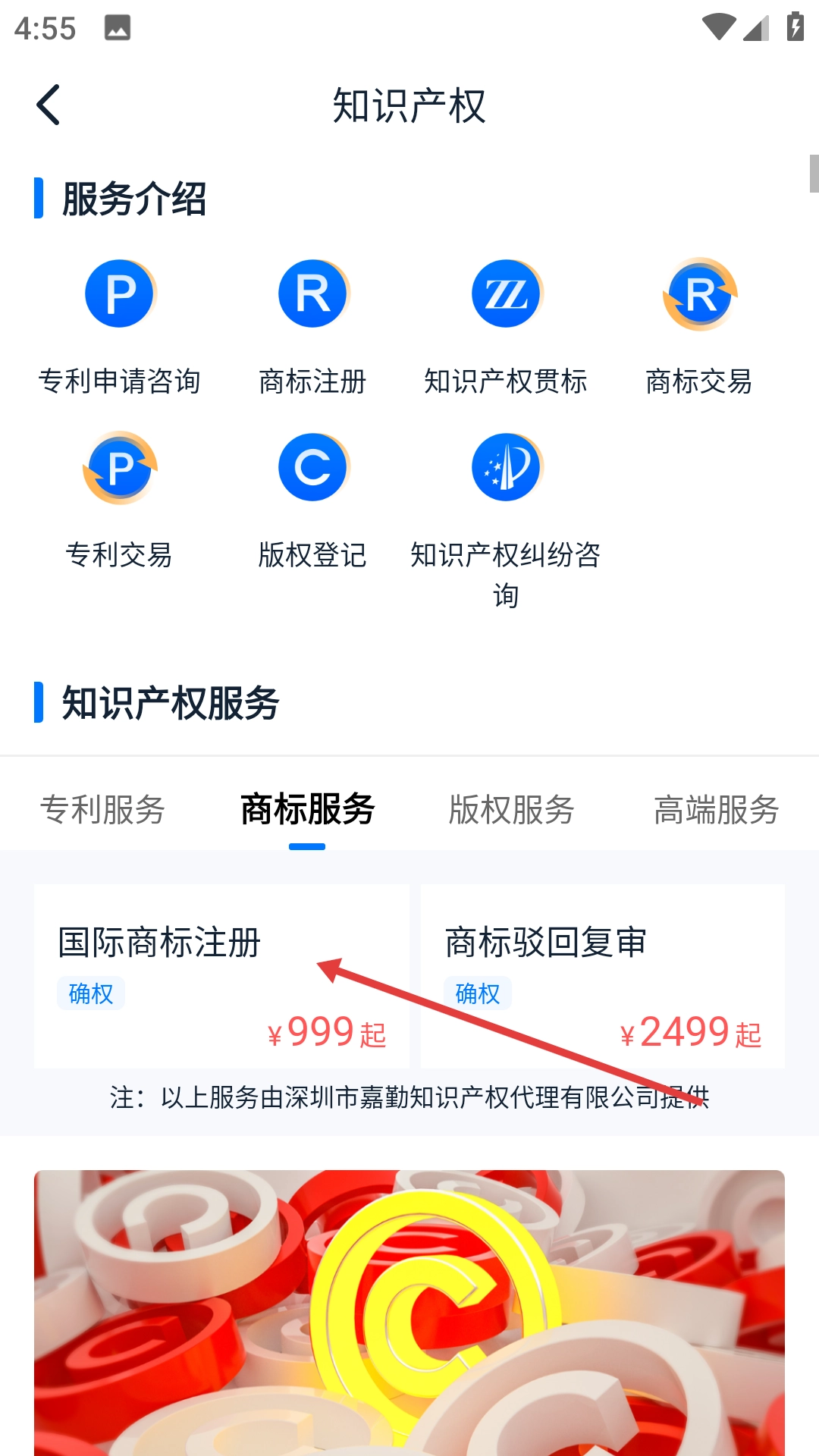 2、在知识产权页面点击【商标服务】选项,进入商标服务页面。