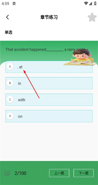 4、接下来是第二题英语单选题,该题目围绕介词运用展开,选项包含at、in等,我继续进行练习,界面布局简洁明了,方便答题操作。