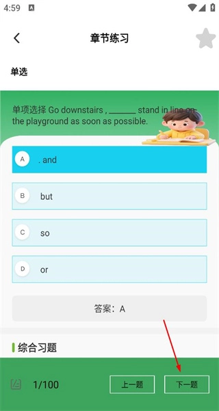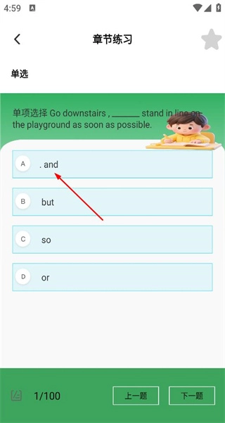 2、进入章节练习页面后,发现第一题是英语单选题,其选项里有and、but这类词汇,选择选项A后,界面会显示出该题的序号。