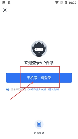 3、进入【VIP伴学】登录页面,选择【手机号一键登录】的方式,登录即视为同意【VIP伴学用户协议】,能快速完成登录操作。