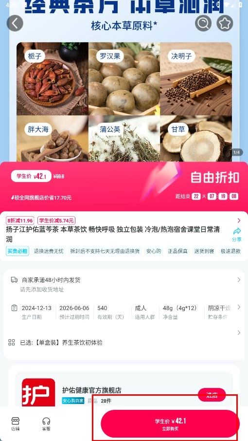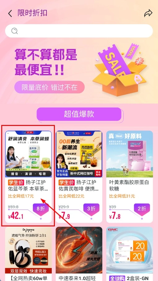 2、在限时折扣页面,挑选像【扬子江护佑蓝芩茶-商品卡片】这类商品卡片,进入到商品详情页面。