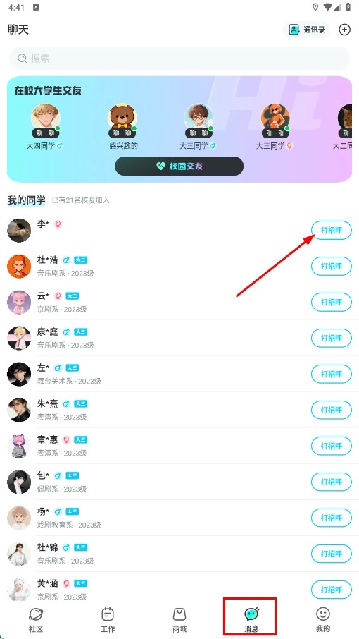 4、点击底部的【消息】功能按钮,进入聊天页面后,可对同学点击【打招呼】功能按钮发起交流。