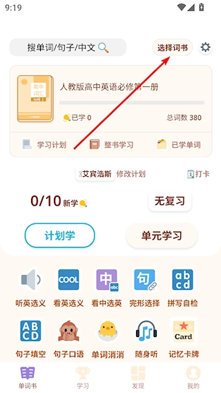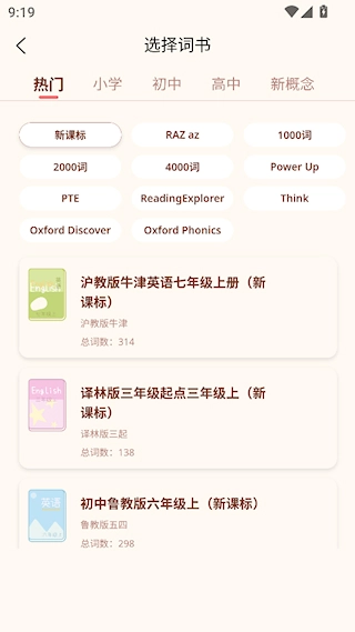 4、教材同步功能:小学、初中、高中至大学阶段的课本单元词汇可实时同步,支持一键切换不同学段的词汇内容