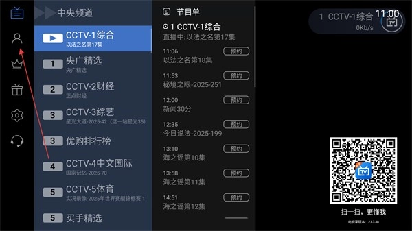 5、打开应用后,您将看到默认的电视直播页面,通常是CCTV频道。
