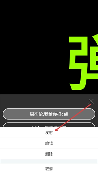 3、在操作选项里点击【发射】按钮,就能把选中的弹幕内容显示在屏幕上。