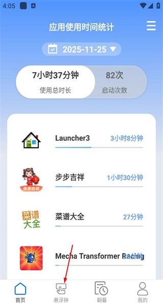1、启动软件后,进入应用使用时间统计的首页,查看各个应用的使用时长,接着点击底部的悬浮钟选项,即可进入桌面悬浮时钟页面。