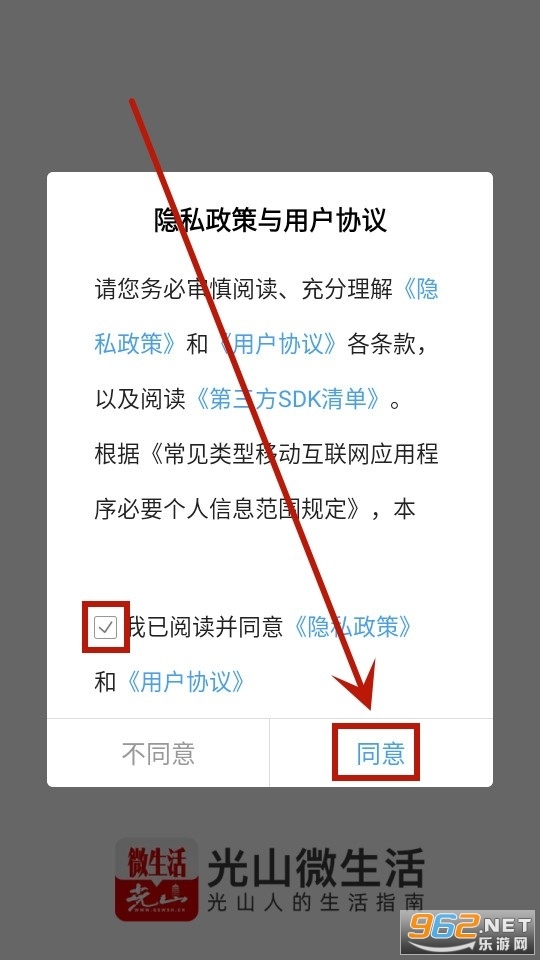1先下载安装光山微生活应用,打开后找到隐私政策相关选项并勾选,接着点击界面上的【同意】按钮即可。