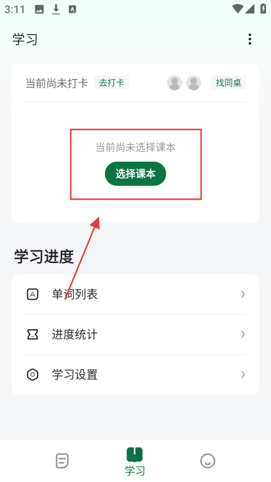 1在学习界面中,如果还没有选定对应的教材,可点击【选择教材】的按钮,跳转至教材选择页面来挑选合适的教材使用。