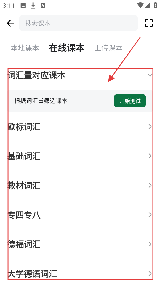 2进入课本选择页面后,系统提供了诸如“与词汇量匹配的课本”“欧洲语言共同参考框架词汇”等不同类别的选项,用户可以依据自身的实际需求直接挑选合适的课本,也能通过测试来筛选出更契合的学习材料。