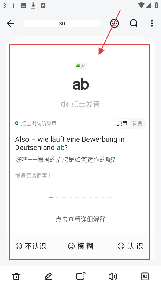 4在词汇学习页面,用户可以浏览到词汇本身、对应的读音以及实际运用的句子等相关信息,能够依照给出的指引进行学习活动,并且可以对自己掌握词汇的熟练情况进行标识。