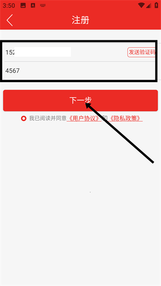 3、在注册页面填写手机号与验证码,同时勾选同意【用户协议】和【隐私政策】,随后点击【下一步】按钮,即可推进注册流程。