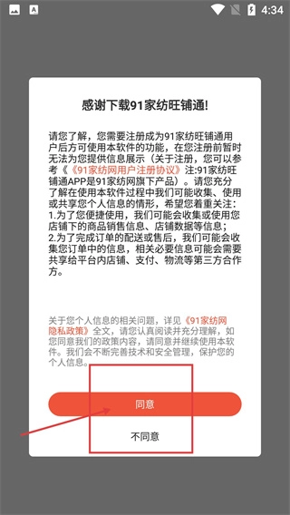 1、在91家纺旺铺通的初始弹窗里,要阅读《91家纺网用户注册协议》,并点击【同意】按钮才能继续使用该应用。