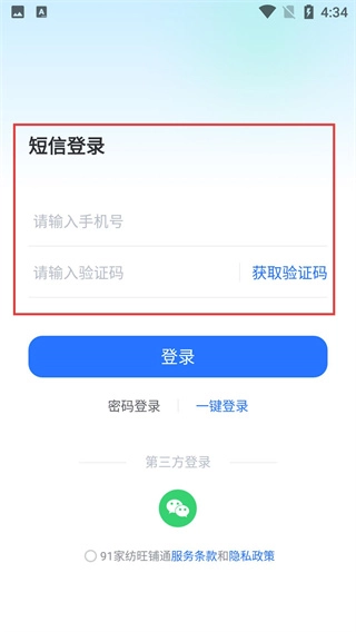进入短信登录页面时,需要填写【请输入手机号】,之后点击【获取验证码】并输入【请输入验证码】,此外也可选择一键登录等其他登录方式。