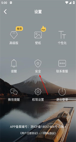 2、进入设置界面后,会呈现高级版壁纸等功能选项,此时选择安全选项,即可进入对应的安全中心页面。