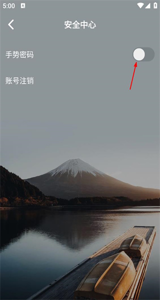 3、进入安全中心页面,找到手势密码的开关选项,开启此开关后会跳转至图形密码设置页面。