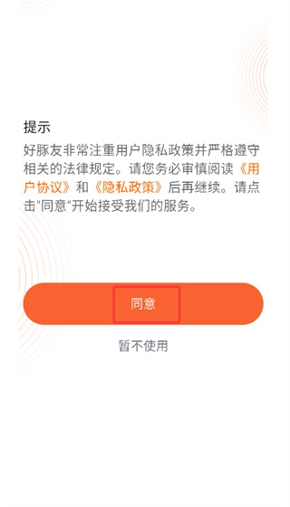 1、第一次打开《好豚友》应用,系统会弹出用户协议的窗口,点击“同意”按钮就能进入主界面。