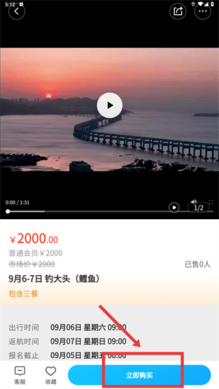 2在游钓项目列表页面,可利用销量、价格、距离等排序维度筛选心仪项目,选定具体活动(例如某两天的鳕鱼垂钓行程)后,点击进入该活动的详细介绍页面。