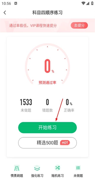 2、进入科目四顺序练习页面后,页面会显示预测通过率以及未做题数量(共1533道),点击“开始练习”按钮即可启动答题流程。