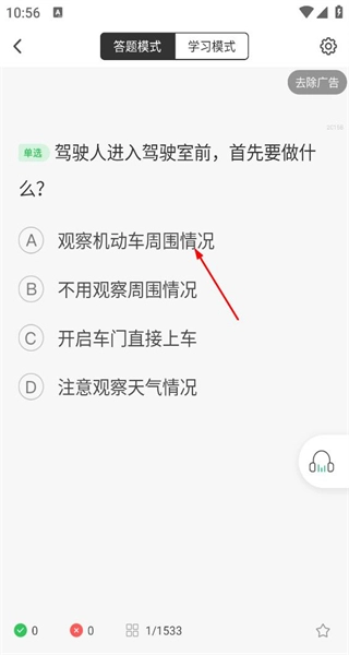 3、进入答题模式页面后,会显示一道单选题,题目询问驾驶人进入驾驶室前的首要操作是什么,驾驶人需选择对应的正确选项,才能继续进行后续答题。