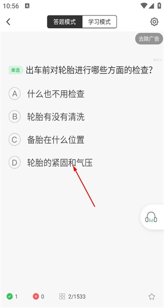 打开软件后进入科目一页面,页面会显示未做题数量为1533道,此时点击“顺序练习”选项,即可进入对应的练习界面。