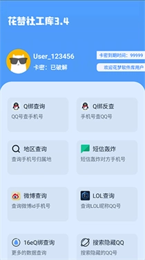花梦社工库这是一款功能全面的工具箱应用,它的一系列实用工具极大地便利了用户在社交平台上的活动。软件提供了多种工具选择,如Q绑查询、微博查询和照妖镜等,不仅满足了用户获取信息的需求,还提升了用户的网络安全意识。
