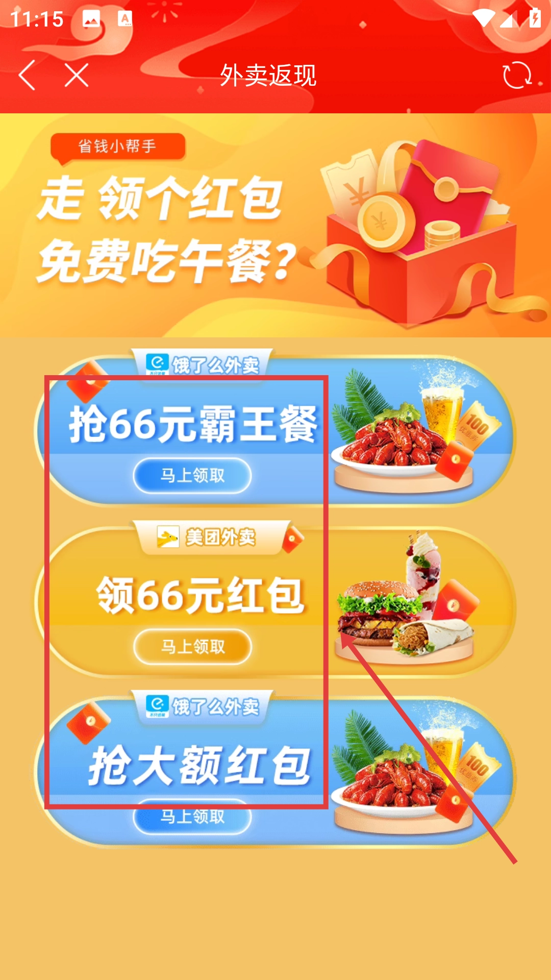4、点击对应的领取按钮,如【立即领取】,领取外卖红包并完成订单,获取返现奖励。