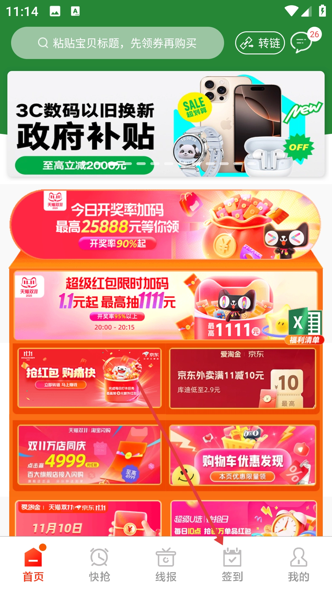 1、点击底部导航栏的【签到】选项,进入签到页面。