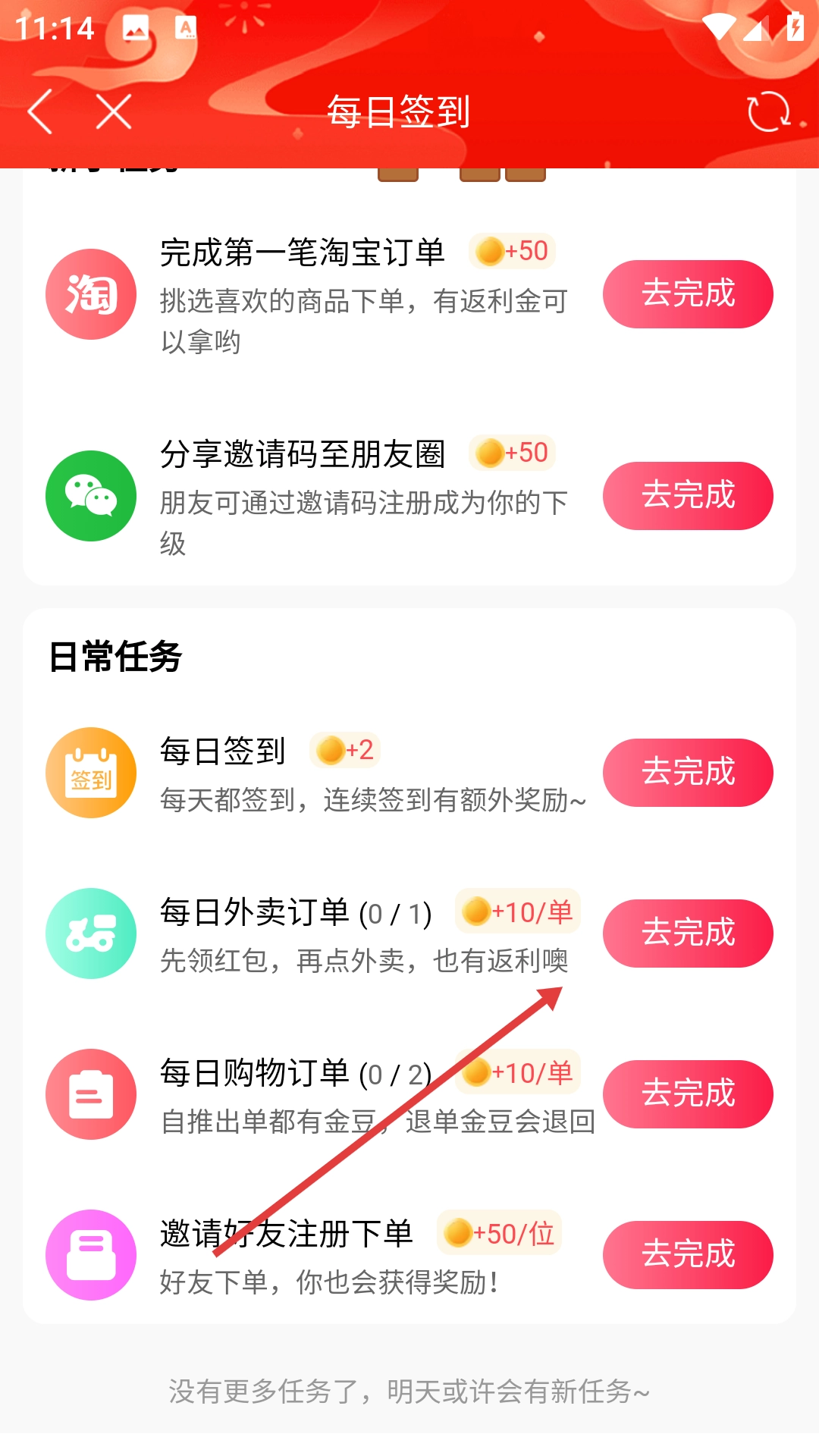 2、在签到页面找到【每日外卖订单】任务,点击【去完成】。