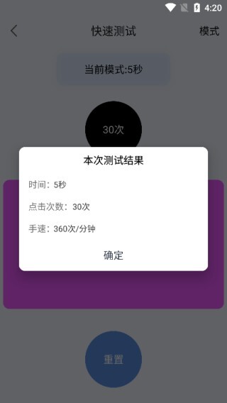2、拿快速点击来说,进入界面后,右上角设有“模式”选项,通过它能够调整点击测试的时间