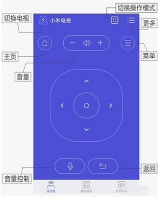 3、小编就以小米电视为例,点击进入“小米电视”后,能看到其软件主界面设计得十分简洁。界面上分布着常见的选择键、确定键、菜单键、主页键、返回键与音量键,下方设有功能选择栏,而右上方则分别排列着切换手势遥控器和更多设置这两个按钮。