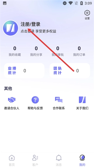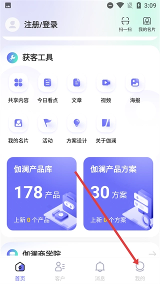 1、打开应用进入首页,此页面设有获客工具、伽澜产品库等功能板块,点击底部导航栏中的【我的】按钮,即可进入个人中心页面。