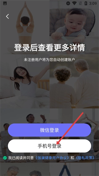 3、进入登录选择界面后,先勾选《伽澜健康用户协议》与《隐私政策》,再选择【手机号登录】的方式,即可进入手机号登录的信息填写页面。