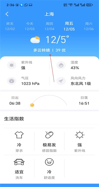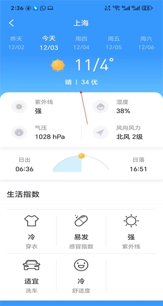 2、进入今日天气详情页面,查看气温、天气状况,以及紫外线、气压等数据,还有对应的生活指数信息。