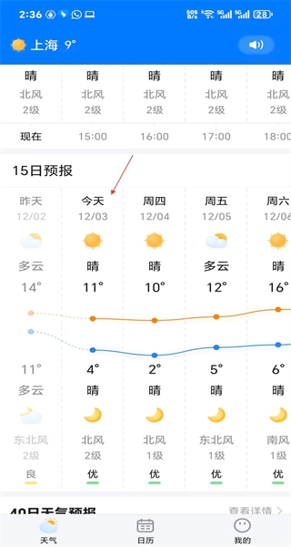 1、打开软件主界面后,找到显示上海15日预报的板块,该板块涵盖了多日天气变化趋势,点击其中的“今天”选项,即可进入当日天气的详细信息页面。