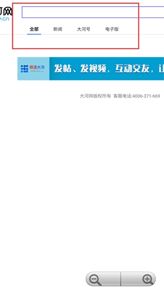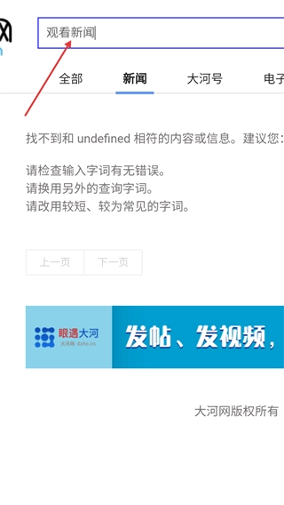 1、进入页面,可见顶部搜索框,下方设有【全部】【新闻】【大河号】【电子版】标签,还有【眼遇大河】的发帖互动横幅。
