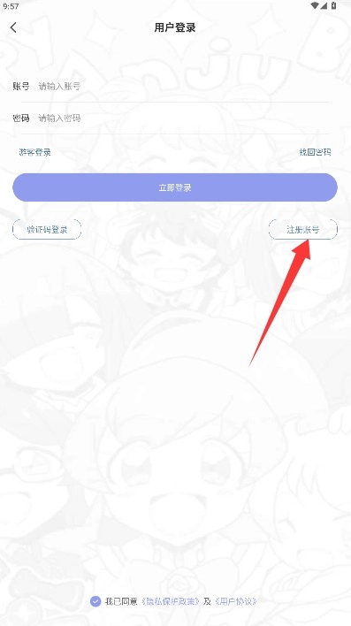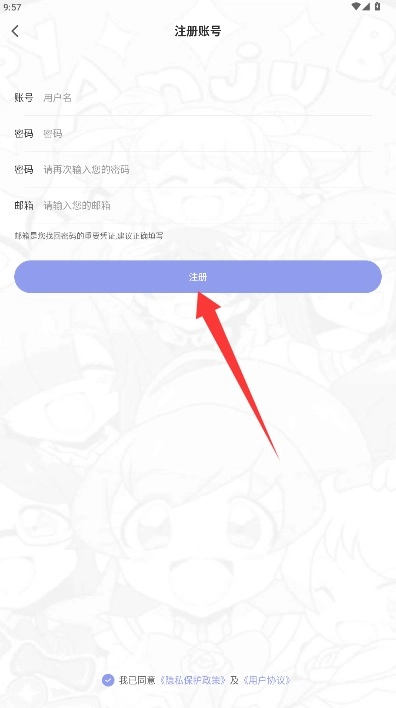 3、在注册界面输入用户名和登录密码,勾选同意相关协议后点击注册完成创建。
