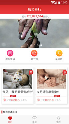 1、指尖善行是一款以慈善捐助为核心的平台,吸引了中华慈善儿童基金会等慈善机构入驻,专注于慈善项目的爱心捐助。目前平台提供善行捐助和爱心商品两类服务,您能便捷了解所捐助项目的进展,查看透明可视的捐助进度,以及浏览大家的爱心评论动态;