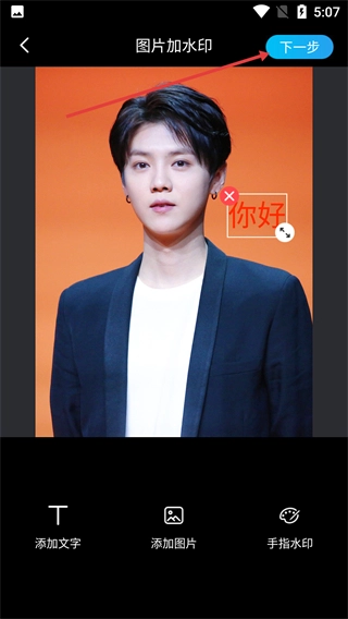 4、输入文字水印(如“你好”)并调整位置后,点击【下一步】按钮,完成水印添加并保存处理后的图片。