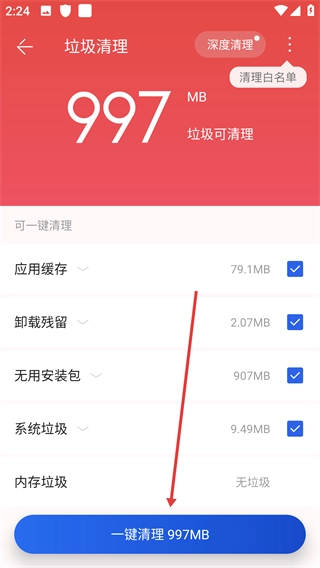 3、在垃圾清理页面找到并点击【一键清理997MB】按钮,即可启动垃圾清理流程。