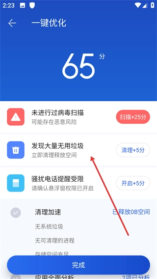 2、在一键优化页面点击【发现大量无用垃圾-清理+5分】的选项,即可进入垃圾清理页面。