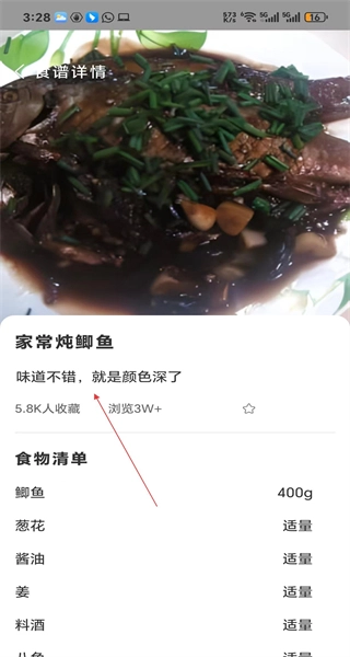 3、打开家常炖鲫鱼的食谱详情页面,查看该菜品的评价以及食物清单,从而了解制作这道菜所需食材的具体用量信息。