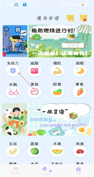 打开软件后,在界面上找到包含免疫力减脂在内的分类选项,点击选择免疫力分类,即可进入增强免疫力的食谱列表页面。