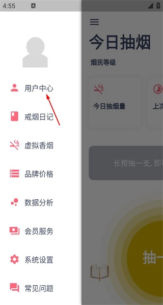 1、打开软件后,进入今日抽烟页面,看到抽一支按钮,点击左上角菜单,展开功能列表。