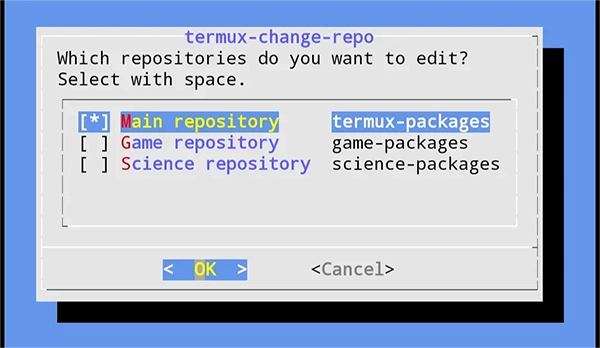 这里以清华大学开源软件镜像的更换为例,在Termux里运行命令termux-change-repo,就能进入如下所示的图形界面。