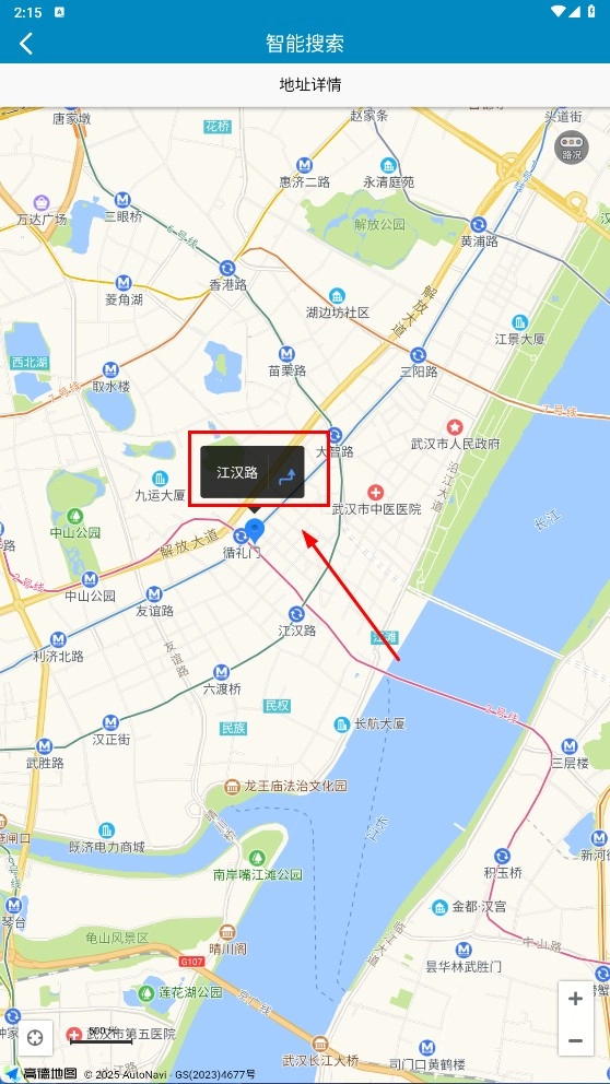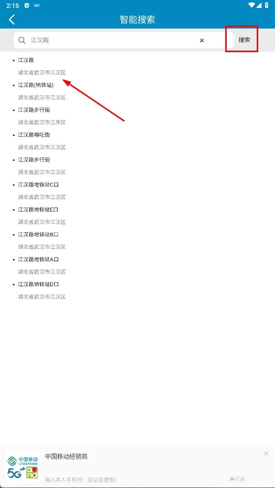 2、在智能搜索页,输入“江汉路”后点击【搜索-功能按钮】,选择对应搜索结果。
