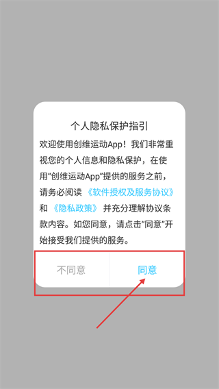 1、进入创维运动App弹出【个人隐私保护指引】,需阅读《软件授权及服务协议》,点击【同意】按钮以继续使用服务。
