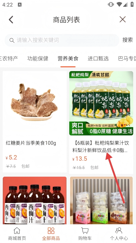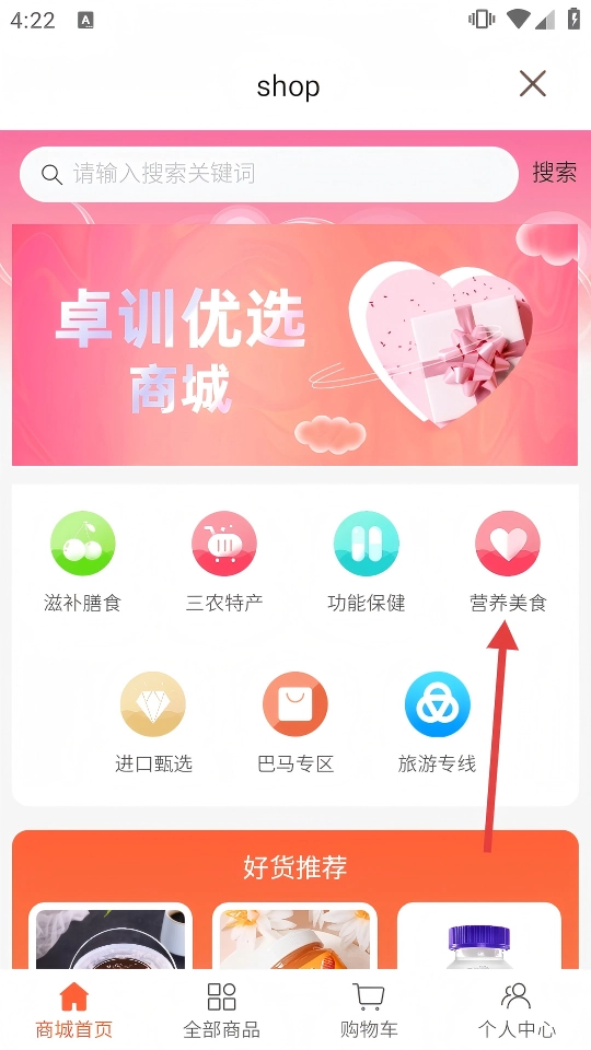 2、在商城页面点击【营养美食】,可查看相关商品。